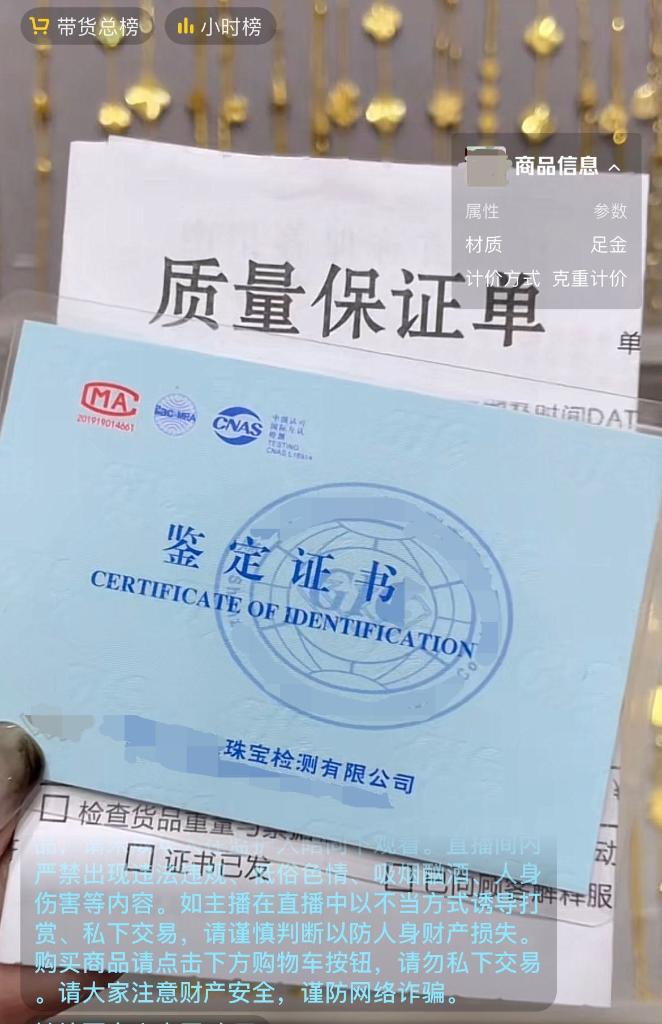 圖為某平臺(tái)店鋪主播展示其所售黃金產(chǎn)品的“鑒定證書(shū)”。