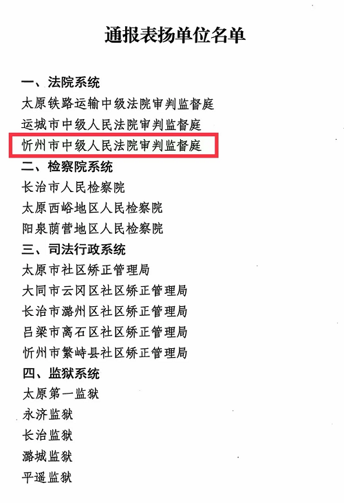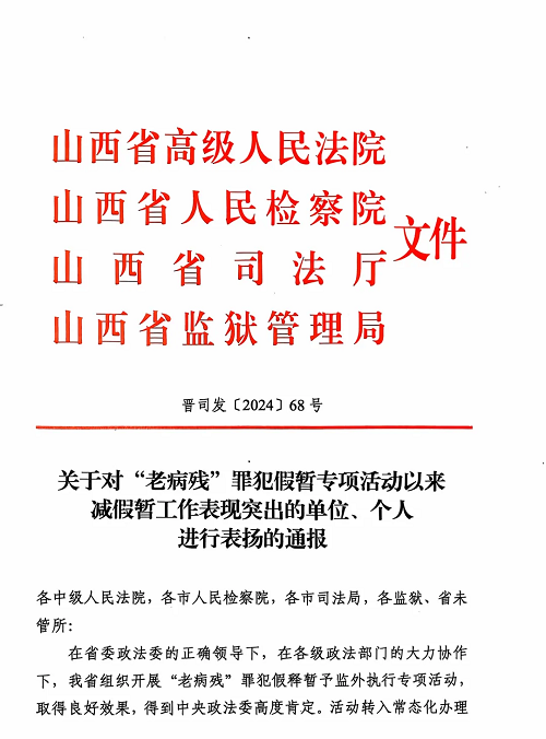 近日,山西省高級人民法院、山西省人民檢察院、山西省司法廳、山西省監(jiān)獄管理局印發(fā)《關(guān)于對“老病殘”罪犯假暫專項活動以來減假暫工作表現(xiàn)突出的單位、個人進行表揚的通報》,對減假暫工作表現(xiàn)突出的16家單位和25名個人予以通報表揚,忻州中院審判監(jiān)督庭獲評“全省減假暫工作表現(xiàn)突出單位”。
