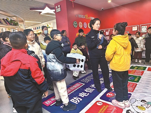 反詐中心民警張曉婉把自制的“反詐飛行棋”鋪在地面。孩子們見有游戲玩,迅速圍了上來(lái)。