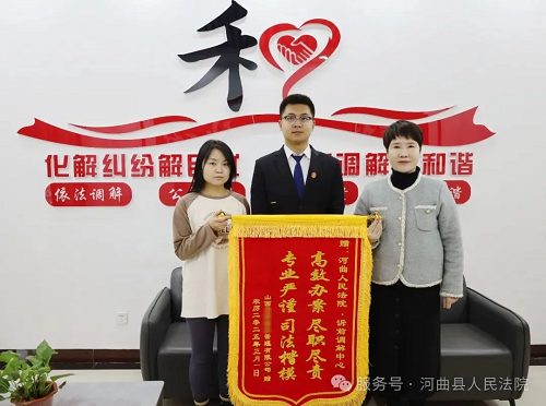 “感謝調(diào)解員為我們排憂解難,提供高效便捷的司法服務(wù),本來以為訴訟時(shí)間會(huì)很長,沒想到這么快就處理好了,今后我們一定努力提高服務(wù)水平?!苯眨澄飿I(yè)公司將一面寫有“高效辦案盡職盡責(zé) 專業(yè)嚴(yán)謹(jǐn)司法楷?!钡腻\旗送至河曲法院訴前調(diào)解中心,對法院溫馨的訴訟服務(wù)和特邀調(diào)解員優(yōu)質(zhì)高效的調(diào)解表示感謝!