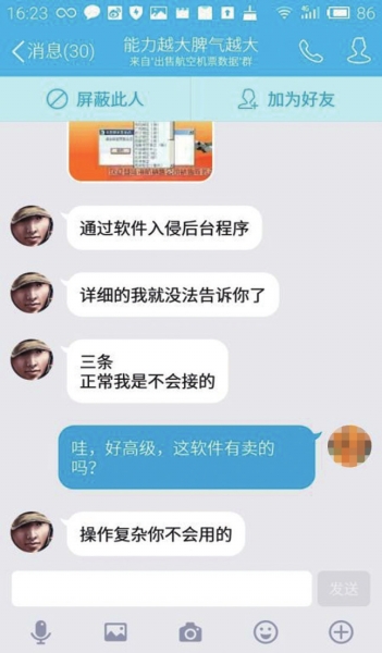 記者以求購(gòu)機(jī)票信息為名在網(wǎng)上找到了十幾名以此為業(yè)的QQ用戶(hù)。其中,用戶(hù)名為“能力越大脾氣越大”的用戶(hù)告訴記者,每條航空機(jī)票信息售價(jià)18元,可以挑選特定的航空公司,買(mǎi)多了,價(jià)格還可以?xún)?yōu)惠。他告訴記者,自己是通過(guò)軟件入侵后臺(tái)程序“調(diào)取”機(jī)票信息,而且都是客戶(hù)有需求的時(shí)候才去“調(diào)取”,保證信息新鮮有效。