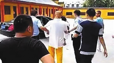 這是安徽蚌埠警方實(shí)施的一次抓捕行動。被帶走時,釋廣聞身著白色寬松上衣、黃色僧袍褲子,沒有任何反抗,表情平靜。