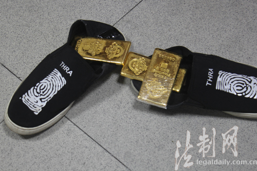 圖為邊防官兵從男子鞋中查出三塊無(wú)合法來(lái)源的金磚