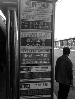 5日,記者來到朝陽區(qū)三間房公交車站,見站牌上除了488路、639路站牌和兩塊公益提示牌外,中間出現(xiàn)了一塊顯示著“公交旅游熱線,長(zhǎng)城——十三陵”的牌子,牌子下方還有一排小字,寫著北京一些著名景點(diǎn)的一日游,往返車費(fèi)50元。記者注意到,不同于其他站牌,這塊公交旅游熱線為不干膠質(zhì)地,表面嶄新干凈,明顯剛粘貼上不久,而正規(guī)公交站牌則是不銹鋼的鋼板。