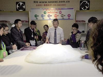 下午2點(diǎn)半,按照行程,旅行團(tuán)將參觀蜀繡,旅行團(tuán)被帶往一家門口寫有“蜀繡蜀錦科技文化展示中心”字樣的單位,但這家單位實(shí)際上是名為“依格爾”的床上用品直銷工廠。講解員簡單講解了有關(guān)蜀繡蜀錦的知識(shí)后,就把游客帶往一個(gè)展覽廳,向游客推介他們工廠的蠶絲床上用品,價(jià)格從3980到6980元不等。