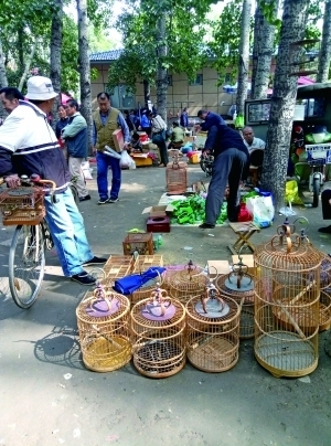 昨天上午,記者來到北沙灘橋附近,看到臨時集市藏身于一片楊樹林里,并被高高的圍墻圍了起來。樹林里賣鴿子的、賣小鳥的、賣魚的、賣蟲的、賣古玩的攤子應(yīng)有盡有。其中,售賣小鳥的攤子有五六個,有的把鳥籠直接掛在樹上,有的則在地上鋪開來,幾十只鳥籠排成一排(如圖)。據(jù)了解,有護鳥志愿者在上周末拍到的圖片中,幾百只鳥兒被關(guān)在籠里售賣。