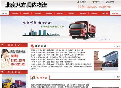 根據(jù)鄭雨描述,昨晚,新京報記者查詢到當(dāng)時雙方建立聯(lián)系的網(wǎng)站,多次撥打服務(wù)電話,均顯示已關(guān)機。頁面信息顯示,北京八方順達(dá)物流(隸屬于北京祥路順達(dá)物流有限公司),公司現(xiàn)有員工2000多人,掌握著廣東發(fā)往全國各地的幾千家貨運專線的資料,并與多數(shù)專線有良好的合作關(guān)系,隨時可以把任何貨物用最低價格發(fā)往國內(nèi)任何地方。