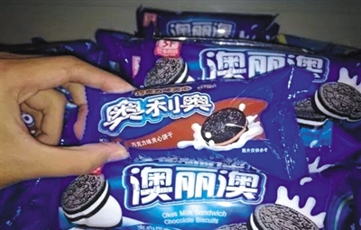 “粵利粵”、“粵利奧”、“奧利棒”……產(chǎn)品外包裝為清一色的藍(lán)色,包括產(chǎn)品構(gòu)圖方面都與正品“奧利奧”餅干極為相似。有的廣告詞都不改:“扭一扭、舔一舔、泡一泡”。
