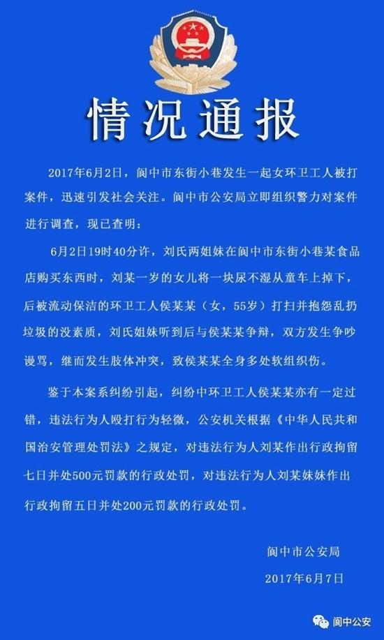 四川在線消息(記者 伍力 )因為一片尿不濕引起糾紛,閬中市兩名年輕女子與一名環(huán)衛(wèi)工人發(fā)生肢體沖突。事件發(fā)生后,引發(fā)廣泛關(guān)注。6月7日,閬中市公安局發(fā)布情況通報,通報如下。