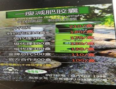 按照規(guī)定,一瘦減肥膠囊(微商俗稱“小綠”)進貨800盒及以上,才能成為官方合作商,進貨價一盒100元。此外,進貨500盒、300盒、100盒、50盒,分別成為金牌總代理、一級代理、二級代理、三級代理,進貨價每盒對應(yīng)分別為110元、130元、150元、170元。若代發(fā)貨一盒,則為210元。
