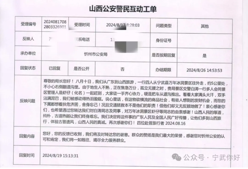 群眾無(wú)小事,點(diǎn)滴映初心。8月19日,寧武縣公安局收到忻州市公安局轉(zhuǎn)來(lái)的山西公安警民互動(dòng)工單,廣東省的嚴(yán)先生在平臺(tái)留言致謝:“8月10日,我們從廣東到山西旅游,一行四人從寧武縣萬(wàn)年冰洞景區(qū)往外走,不小心右側(cè)翻到溝里。由于人生地不熟,正在焦急萬(wàn)分,孤立無(wú)援之時(shí),貴局景區(qū)民警白濤一行多人會(huì)同景區(qū)管理人員一起趕到,大家齊心協(xié)力,硬是把車從道溝推出.....山西人民的厚道淳樸、古道熱腸讓我們終身難忘,我們決定將這件事向廣東人民及全國(guó)人民友好傳播,讓他們多到山西旅行,體驗(yàn)古晉遺風(fēng),山西人民的真誠(chéng)。再次感謝你們!”