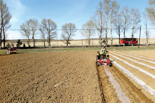 時(shí)下正值春耕春播時(shí)節(jié),我市各地的農(nóng)民忙著翻地、撒肥、鋪膜、犁土、播種,田野上拖拉機(jī)、播種機(jī)等農(nóng)機(jī)來回穿梭,一片繁忙景象。圖為4月21日五寨縣小河頭村村民正在鋪膜。(張志遠(yuǎn) 攝)