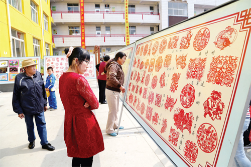 近日,靜樂縣利民小學(xué)舉辦校園書法、繪畫和剪紙作品展。據(jù)悉,此次活動(dòng)共收到美術(shù)作品300 余件、書法作品300 余件、剪紙作品600 件。通過一件件作品表達(dá)了孩子們對(duì)美麗“中國(guó)夢(mèng)”的憧憬。圖為學(xué)生和家長(zhǎng)在參觀展覽。(閆曉梅 攝)