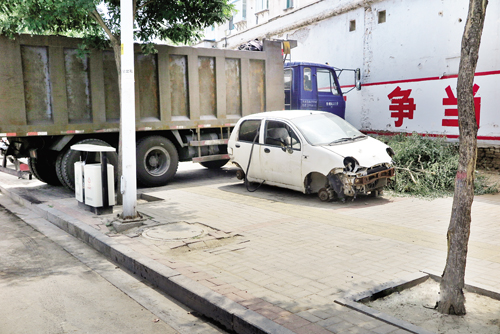 近日,記者途經(jīng)城區(qū)長征西街時(shí),發(fā)現(xiàn)路旁的人行便道有的被“僵尸車”長期占道。一輛奇瑞汽車四個(gè)輪轂已沒了身影,擋風(fēng)玻璃布滿裂痕,看上去這輛車已經(jīng)在此停放了很久,基本上已經(jīng)報(bào)廢,不能再投入使用。