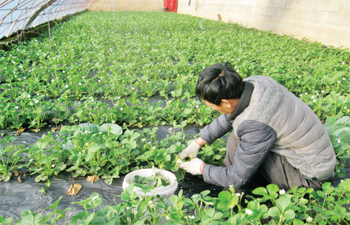 河曲縣農(nóng)民孫寶元利用日光大棚技術(shù)開展冬季草莓種植,3座日光大棚安排種植了早、中、晚熟三個品種。早熟品種將在新年開園,光是頭茬就預計能賣1萬元,草莓種植帶他駛?cè)肓酥赂坏目燔嚨馈?span style="font-family: 楷體,楷體_gb2312, simkai">圖為孫寶元正在大棚修剪草莓。(賈金理 攝)