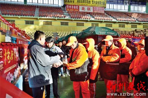 1月19日上午,山西熊奪寶網(wǎng)絡(luò)科技有限公司面向忻州市環(huán)衛(wèi)系統(tǒng)開(kāi)展“獻(xiàn)愛(ài)心迎佳節(jié)”活動(dòng),來(lái)自忻州市市容環(huán)境衛(wèi)生管理處的50名環(huán)衛(wèi)工人代表,每人領(lǐng)到了一份新鮮雞蛋。現(xiàn)場(chǎng)的一位工作人員告訴記者:“環(huán)衛(wèi)工人們?yōu)榱顺鞘械母蓛粽麧嵏冻隽诵燎诘暮顾?,希望這些雞蛋能為他們補(bǔ)補(bǔ)身體。除現(xiàn)場(chǎng)領(lǐng)取雞蛋的50名環(huán)衛(wèi)工人之外,我市另外的1000多名環(huán)衛(wèi)工人也將陸續(xù)領(lǐng)到愛(ài)心雞蛋?!鳖I(lǐng)到雞蛋的環(huán)衛(wèi)工李大姐高興地說(shuō):“今年過(guò)年雞蛋也不用買(mǎi)了,實(shí)在是太好了!”(王菲 郭劍鳴 攝)