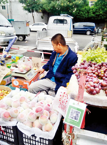 7月30日,位于和平街市中級(jí)人民法院旁的便民市場(chǎng)上,一位水果商販正在出售水果。三輪車上掛著微信支付二維碼,告訴顧客可以用手機(jī)掃一掃買水果。小販說:“現(xiàn)在用手機(jī)支付的人越來越多,特別是年輕人。手機(jī)支付,不用找零,不怕假幣,‘掃一掃’,就是好!”