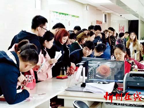 本報(bào)訊10月10日,寓意“十全十美、幸??鞓贰?,一大早,在城區(qū)慕山南路忻府區(qū)政務(wù)大廳前,就有好幾對(duì)準(zhǔn)新人等候在那里,準(zhǔn)備領(lǐng)取結(jié)婚證。記者在現(xiàn)場(chǎng)看到,還有一對(duì)對(duì)準(zhǔn)新人正陸續(xù)走進(jìn)大廳。