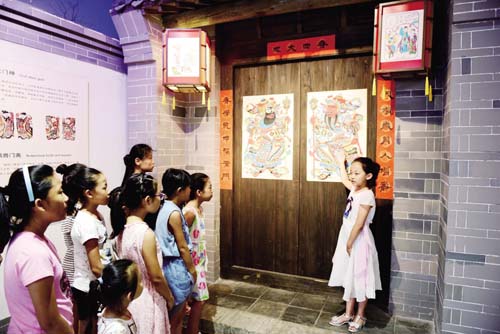 7月30日,小講解員在武強(qiáng)年畫博物館介紹年畫門神。