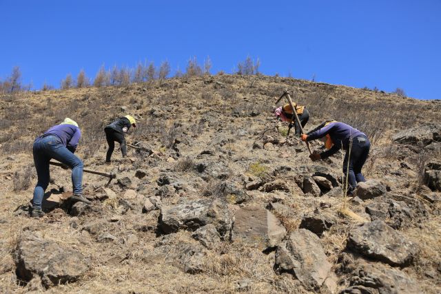 塞罕壩機械林場工人在石質陽坡上造林(2016年4月13日攝)。新華社發(fā)