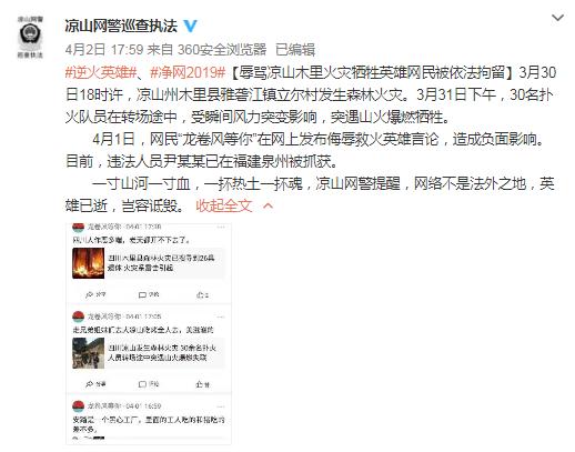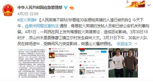 4月2日晚十時(shí)許,中華人民共和國(guó)應(yīng)急管理部通報(bào)了該事件,并稱(chēng)“人民英雄不容玷污!辱罵30名犧牲英雄的人渣已被刑拘”。
