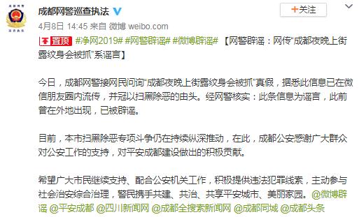 4月8日,成都網(wǎng)警對(duì)此辟謠稱:接網(wǎng)民問(wèn)詢“成都夜晚上街露紋身會(huì)被抓”真假,據(jù)悉此信息已在微信朋友圈內(nèi)流傳,并冠以掃黑除惡的由頭。經(jīng)網(wǎng)警核實(shí),此條信息為謠言,此前曾在外地出現(xiàn),已被辟謠。目前,本市掃黑除惡專項(xiàng)斗爭(zhēng)仍在持續(xù)縱深推動(dòng),在此,成都公安感謝廣大群眾對(duì)公安工作的支持,對(duì)平安成都建設(shè)做出的積極貢獻(xiàn)。希望廣大市民繼續(xù)支持、配合公安機(jī)關(guān)工作,積極提供違法犯罪線索,主動(dòng)參與社會(huì)治安綜合治理,警民攜手共建、共治、共享平安城市、美麗家園。