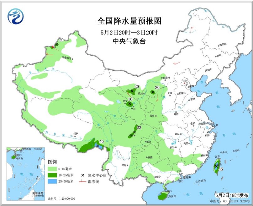 5月2日20時至3日20時,新疆西部、青藏高原中東部、西北地區(qū)中東部、內(nèi)蒙古西部、西南地區(qū)北部和東部、華南南部、臺灣島等地有小到中雨,其中,西藏東南部、海南島南部、臺灣島中部等地局地有大雨或暴雨(見圖1)。新疆西部、內(nèi)蒙古東部等地有4~6級風(fēng),新疆山口地區(qū)風(fēng)力可達(dá)8~9級。