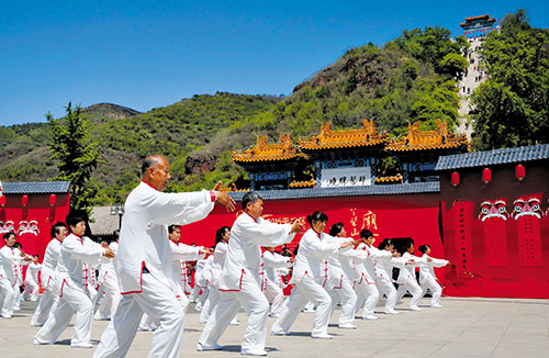 5月5日,北京平谷區(qū)劉家店鎮(zhèn)舉辦丫髻山第三十屆休閑文化廟會(huì),開展威風(fēng)鑼鼓、秧歌花會(huì)、百人太極等表演活動(dòng)和書法雅集、文創(chuàng)展示等文化活動(dòng),吸引大批來(lái)自京津冀地區(qū)的游人參加。圖為劉家店鎮(zhèn)的老年人在文化廟會(huì)上表演太極拳。新華社記者 李欣 攝