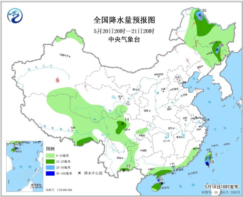 5月20日20時(shí)至21日20時(shí),四川盆地西部、黑龍江西北部和東南部、吉林東北部、廣東西南部、廣西東南部、海南島東北部等地的部分地區(qū)有中到大雨,局地有暴雨(50~65毫米)。內(nèi)蒙古東部、東北地區(qū)中南部、華北北部、黃淮東部等地的部分地區(qū)有4~6級風(fēng)。南疆盆地等地局地有浮塵或揚(yáng)沙。