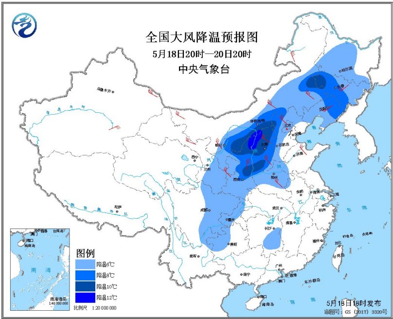 預(yù)計(jì),5月18日20時(shí)至20日20時(shí),西北地區(qū)大部、華北大部、東北地區(qū)、黃淮、新疆等地的部分地區(qū)有5~7級風(fēng),陣風(fēng)可達(dá)8~9級,其中,內(nèi)蒙古中部和東部、山西北部、河北北部等地局地陣風(fēng)可達(dá)10級以上;東北地區(qū)大部、華北中東部、黃淮西部、西北地區(qū)東部、西南地區(qū)東部等地最低溫度或平均溫度將下降6~8℃,其中,內(nèi)蒙古中部偏南地區(qū)、陜西北部、山西北部、吉林西部等地的部分地區(qū)降溫10℃以上。中央氣象臺5月18日18時(shí)繼續(xù)發(fā)布大風(fēng)降溫預(yù)報(bào)。