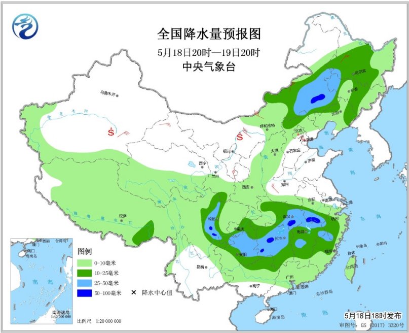 5月18日20時(shí)至19日20時(shí),內(nèi)蒙古中東部、東北地區(qū)中部、四川盆地西部、西南地區(qū)東部、江漢、江南等地的部分地區(qū)有中到大雨,其中內(nèi)蒙古東南部、四川盆地西南部、湖南北部、湖北南部、安徽南部等地局地有暴雨(50~80毫米),上述部分地區(qū)有短時(shí)強(qiáng)降水,局部并伴有雷暴大風(fēng)等強(qiáng)對流天氣。西北地區(qū)中東部、內(nèi)蒙古大部、華北、東北等地的部分地區(qū)有5~7級風(fēng),局地陣風(fēng)8~9級。內(nèi)蒙古西部、南疆盆地等地有揚(yáng)沙或浮塵天氣。