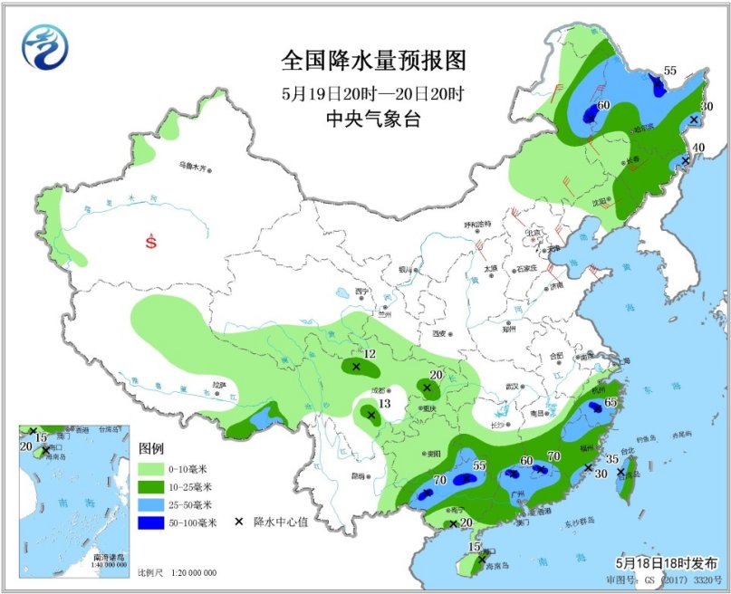 5月19日20時(shí)至20日20時(shí),內(nèi)蒙古東北部、東北地區(qū)中北部、江南南部和東部、華南大部等地的部分地區(qū)有中到大雨,局地有暴雨(50~70毫米)。內(nèi)蒙古中東部、華北、黃淮、東北地區(qū)中南部等地的部分地區(qū)有4~6級風(fēng),陣風(fēng)7~8級。南疆盆地等地局地有揚(yáng)沙或浮塵。渤海西南部海域?qū)⒂?~8級、陣風(fēng)9~10級的西北風(fēng)。