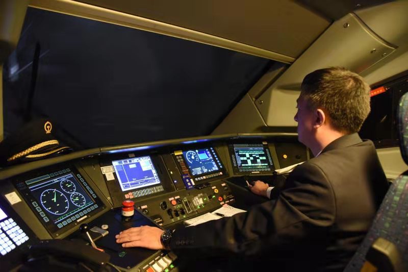 當D6770次列車到達呼和浩特東站,弓國慶登上機車,與換班司機交接完畢后,插入IC卡,認真核對行車數(shù)據(jù)、確認操縱臺各儀表……各項安全準備工作無誤后,隨著機車前方發(fā)車信號變?yōu)榫G燈,與車站進行車機聯(lián)控確認,隨著一聲汽笛長鳴,動車組緩緩駛出呼和浩特東站?!皬氐撞t望,確認信號,高聲呼喚,手比眼看”的標準化作業(yè)與每三十秒腳踩提醒踏板的一系列操作流暢默契……盡管這種周而復(fù)始的工作他已重復(fù)了成千上萬遍,但從不敢松懈。