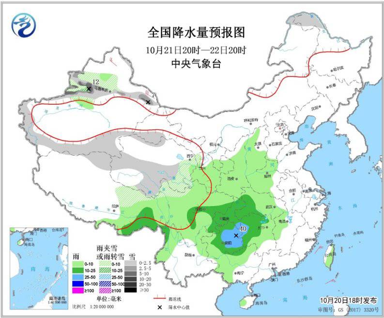 10月20日20時至21日20時,新疆北疆北部和西部、青海南部、西藏北部、內(nèi)蒙古東北部、黑龍江西北部等地的部分地區(qū)有小到中雪或雨夾雪,其中,北疆北部山區(qū)有大到暴雪(10~18毫米)。西藏東南部、陜西南部、四川盆地東部、重慶大部、貴州北部等地的部分地區(qū)有中到大雨(10~40毫米)。內(nèi)蒙古東部、東北地區(qū)北部、新疆北部、西藏北部等地的部分地區(qū)有4~6級風,新疆山口風力可達10級左右(見圖1)。