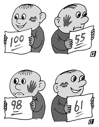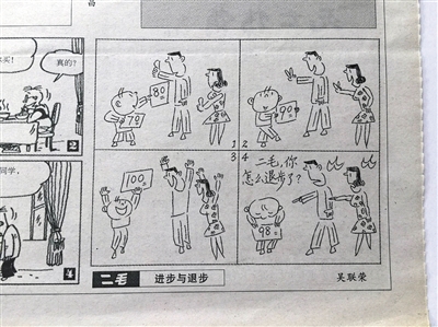 一個孩子考了100分,受到表揚。后來考了98分,結(jié)果被打了耳光;另一孩子考了55分,被打了耳光。第二次考了61分,卻受到表揚:這幅名為《進步與退步》的四格漫畫,入選為2016年高考全國卷1的作文題目。