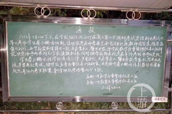 通報(bào)稱,在當(dāng)天下午學(xué)校組織的2017屆高三第二次調(diào)研考試英語科目考試中,第10考場學(xué)生秦正鵬喝飲料。“秦正鵬無視學(xué)??荚嚰o(jì)律,嚴(yán)重違紀(jì),為教育本人,警示全校學(xué)生,規(guī)范參加考試,嚴(yán)肅考紀(jì)考風(fēng)”,“決定給予秦正鵬開除校籍留校察看處分,并記入考生檔案。”