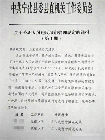 在路邊攤點買菜,卻被全縣范圍通報。有網友質疑,寧化縣這一做法“用力過猛”。在接受新京報記者采訪時,寧化縣委黨工委上述工作人員稱,這一通報依據,系由寧化縣委出臺的《關于機關黨員干部在城市管理中嚴格遵守“三帶頭八不準”行為規(guī)范的通知》。通知中,對于黨員干部的違規(guī)情形和處理結果進行了規(guī)定。