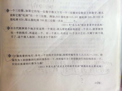 “150盞亮著的電燈,各有一個拉線開關控制,被順序編號為1,2,3,4,…,150。將編號為3的倍數的燈的拉線各拉一下,再將編號為5的倍數的拉線各拉一下,拉完后亮著的燈數為幾盞?”這是一道考公因數和公倍數的思維數學題,今年暑假,才上完三年級的羅弋在做四年級的數學競賽題集《培優(yōu)新幫手》時遇到此題,算出答案“90”與標準答案“80”不符,媽媽陳群只當兒子錯了。