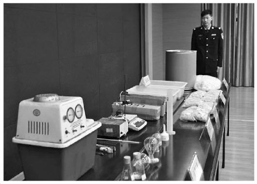 圖為黃岡警方展示繳獲的部分毒品及制毒工具。 張瑜 攝