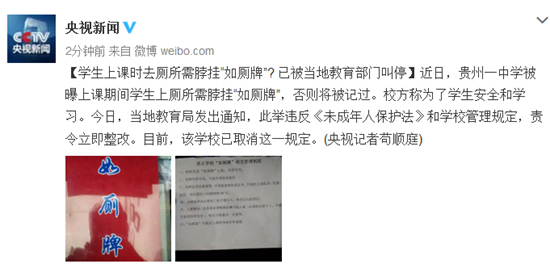 央視新聞微博截圖。 近日,貴州一中學(xué)被曝上課期間學(xué)生上廁所需脖掛“如廁牌”,否則將被記過。校方稱為了學(xué)生安全和學(xué)習(xí)。今日,當(dāng)?shù)亟逃职l(fā)出通知,此舉違反《未成年人保護(hù)法》和學(xué)校管理規(guī)定,責(zé)令立即整改。目前,該學(xué)校已取消這一規(guī)定。 (責(zé)任編輯:梁艷) |