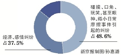 以陜西西安臨潼區(qū)檢察院所辦案件為例,因碰撞、口角、玩笑,甚至眼神、微小日常摩擦事件引起的糾紛占48.6%,經(jīng)濟、感情糾紛占37.5%