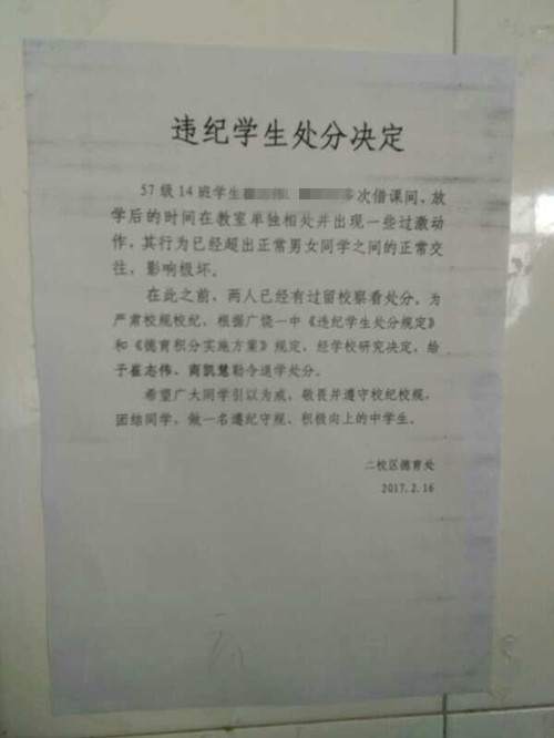 17日晚,商先生向大眾網(wǎng)記者提供了一份落款為二校區(qū)德育處的違紀學(xué)生處分決定,大體內(nèi)容為:57級14班學(xué)生阿強(化名)、小芳多次借課間、放學(xué)后的時間在教室單獨相處并出現(xiàn)一些過激動作,其行為已經(jīng)超出正常男女同學(xué)之間的正常交往,影響極壞。在此之前,兩人已經(jīng)有過留校察看處分。為嚴肅校規(guī)校紀,根據(jù)廣饒一中《違紀學(xué)生處分規(guī)定》和《德育積分實施方案》規(guī)定,經(jīng)學(xué)校研究決定,給予兩人勒令退學(xué)處分。