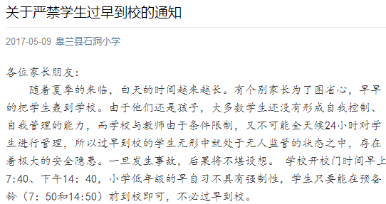 甘肅省皋蘭縣石洞小學今日推出《關于嚴禁學生過早到校的通知》,學校開校門時間分別為早上7:40、下午14:40,學生只要能在預備鈴時間7:50、14:50前到校即可,不必過早到校。