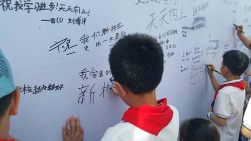 一進入新校區(qū),新穎別致,獨特的外觀設計深深吸引了學生和家長,校門口的一座石雕,極具品味與觀賞,校名和建校時間深藏其中,創(chuàng)意精巧,別具一格,整個校園建筑別致,綠樹成蔭,花草綻放,充滿了濃厚的文化氣息,校區(qū)圍墻由119塊文化墻組成,校園外墻古詩詞寓意深遠,校園內(nèi)墻名勝古跡、傳統(tǒng)體育項目耳目一新。在講解老師的帶領下,大家步入教學樓、綜合樓、圖書樓、藝術樓、操場、連廊、教室、庭院等做了詳細講解;對學校的文化建設、校園綠化、活動場地、文化墻、百草園、應急安全通道、課桌橙、環(huán)保知識與每一位學生、家長共同分享。每到一處都吸引了家長們駐足觀光,孩子更是看到美麗的校園興奮不已,家長、學生們紛紛在祝福墻上留言,“我愛我的新校區(qū)”真實地表達出了孩子們的心聲,“新長小真美啊,我要好好學習”展現(xiàn)了孩子們的信心和決心。“祝長校越辦越好”表達出了家長們的祝福,“放飛理想的地方”是家長對學校的認可,“新校區(qū)、新起點、新氣象、新未來”道出了對學校發(fā)展的祈盼……功能齊全、環(huán)境典雅、風格獨特,極富現(xiàn)代品味的忻州長小將閃亮登上忻州教育的舞臺,大家看著美麗又大氣的現(xiàn)代化校園,流連忘返,倍感自豪,紛紛表示對學生即將開始的新校區(qū)學習生活充滿期待。