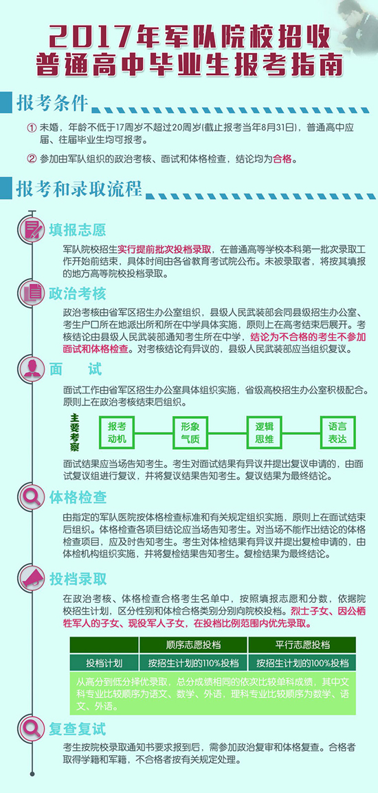 深入推進(jìn)陽光招生。據(jù)了解,軍委機(jī)關(guān)業(yè)務(wù)部門將采取四項(xiàng)措施,深入推進(jìn)軍隊(duì)院校招生工作陽光工程。一是加大信息公開力度。進(jìn)一步健全完善以政策規(guī)定、招生計(jì)劃、考生資格、考試成績(jī)、錄取信息、申訴渠道和違規(guī)處理為主要內(nèi)容的信息公開制度,做到全過程跟進(jìn)、全媒體覆蓋、全要素公開,在招生錄取的各個(gè)關(guān)鍵環(huán)節(jié),全面及時(shí)發(fā)布權(quán)威資訊,搞好政策解讀和宣傳引導(dǎo),擴(kuò)大信息公開公示的覆蓋面。二是強(qiáng)化運(yùn)行過程管控。扭住重點(diǎn)關(guān)鍵環(huán)節(jié)細(xì)化責(zé)任、加強(qiáng)管控、不留死角。青年學(xué)生招生重點(diǎn)是政治考核、面試體檢、投檔錄取等環(huán)節(jié),士兵學(xué)員招生重點(diǎn)是選拔推薦、考務(wù)組織、集中錄取等環(huán)節(jié)。通過教育和培訓(xùn)相結(jié)合、人防和技防相結(jié)合、檢查和問責(zé)相結(jié)合,堅(jiān)決杜絕各種違規(guī)違紀(jì)現(xiàn)象發(fā)生。三是實(shí)行聯(lián)合檢查督導(dǎo)。加強(qiáng)招生工作專項(xiàng)檢查督導(dǎo),軍地有關(guān)部門、軍隊(duì)各級(jí)職能部門組成聯(lián)合檢查組,不打招呼式開展巡視督導(dǎo)。四是堅(jiān)持從嚴(yán)執(zhí)紀(jì)問責(zé)。對(duì)查證屬實(shí)的違規(guī)違紀(jì)問題,依法依紀(jì)嚴(yán)肅處理,倒查追究有關(guān)單位和個(gè)人責(zé)任。