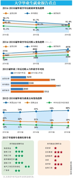 昨日下午,由麥可思研究院撰寫、社會科學文獻出版社出版的《2017年中國本科生就業(yè)報告》在北京發(fā)布。報告對14.7萬2016屆大學本科畢業(yè)生和14.2萬高職高專畢業(yè)生進行跟蹤調(diào)查,并對11.4萬2013屆大學本科畢業(yè)生三年后的就業(yè)和收入情況再次調(diào)查。