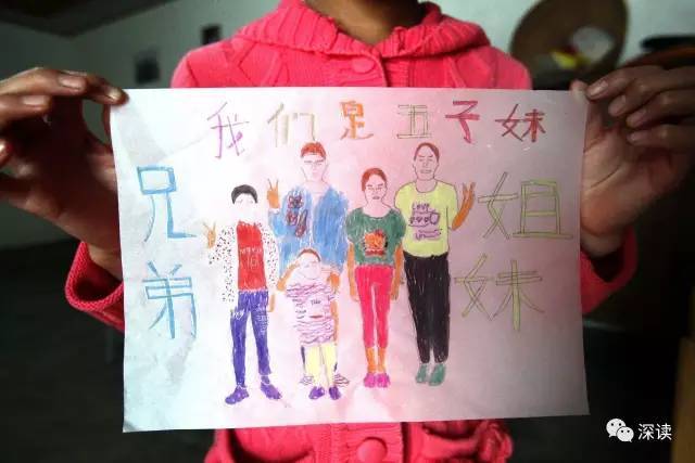 前段時間,衣伍木用畫筆給兄弟姐妹們畫了一張“全家?!?,這耗費了她一天的時間。在畫里,五姐弟每個人都穿著彩色的服裝,她在畫的周圍也用彩筆寫著:兄弟姐妹,我們是五子妹(注:四川話,姊妹,表示家里的兄弟姐妹)。兩年前,在媒體記者給她們拍攝的眾多家庭合影中,五姐弟的表情都顯得有些無助和失落。但這次,在衣伍木的畫里,五姐弟都是開心的笑臉,手里還比著V。