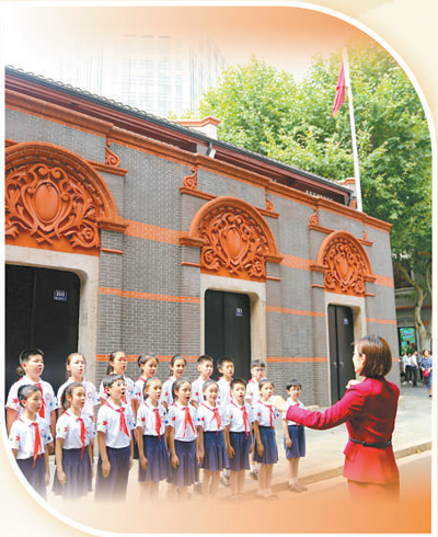 中共一大會址,上海市的小學(xué)生在老師指揮下齊唱《沒有共產(chǎn)黨就沒有新中國》。陳亞東攝