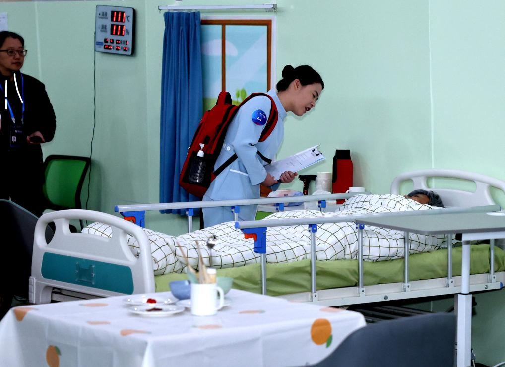 5月8日,第二屆全國鄉(xiāng)村振興職業(yè)技能大賽養(yǎng)老護理項目比賽現(xiàn)場。新華社記者 劉續(xù) 攝