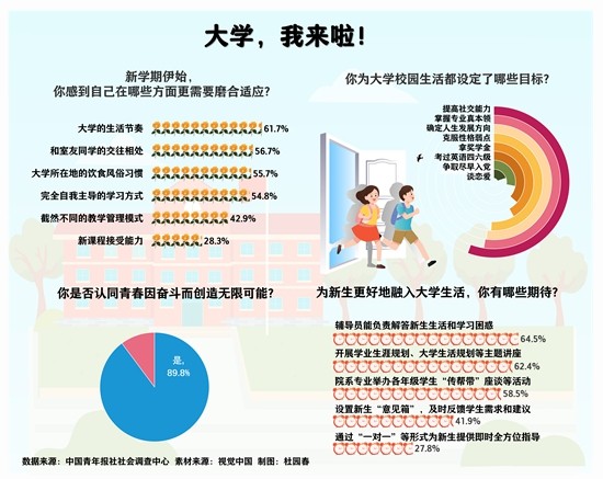 開學(xué)季,大一新生陸續(xù)報到,開啟了全新的校園生活。人際交往、學(xué)習(xí)氛圍、生活方式……各方面都需要去探索和適應(yīng)。面對嶄新的人生階段,他們準(zhǔn)備好了嗎?他們?yōu)樽约旱拇髮W(xué)設(shè)立了什么目標(biāo)?